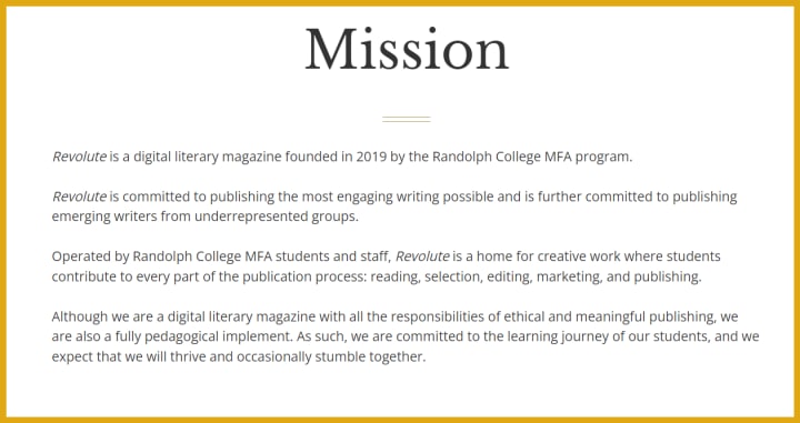 "Operated by Randolph College MFA students and staff, Revolute is a home for creative work where students contribute to every part of the publication process: reading, selection, editing, marketing, and publishing."