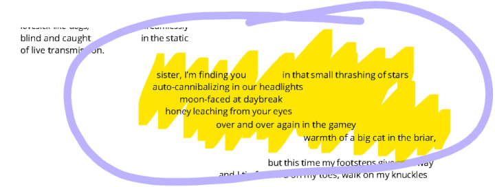 This part is hard because there are many poems I like in this issue, and it feels as if leaving them out is to say they aren't skilled, touching or otherwise excellent. Alas, I have to whittle them down. Let me assure you the curation in issue 3 is excellent. While not all poems are for all people, you won't waste your time reading the pieces in this issue, whether I've highlighted them or not. I'll start with the poet and their work that most stood out to me, and then give you a few other recommendations.