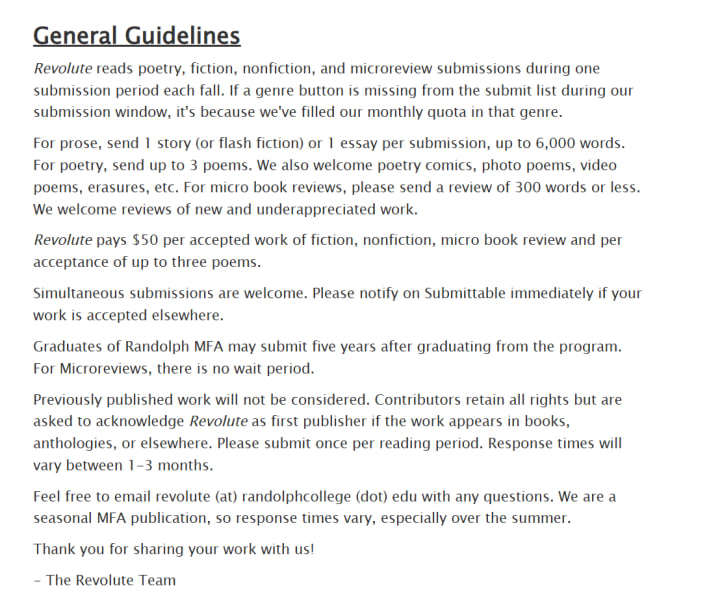 - You can find their full guidelines on submittable and should always follow those guidelines over this review.