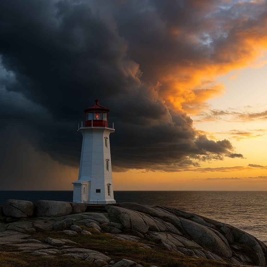 A lighthouse stands firm as the storm parts, golden light breaks through, and hands clasp in solidarity.