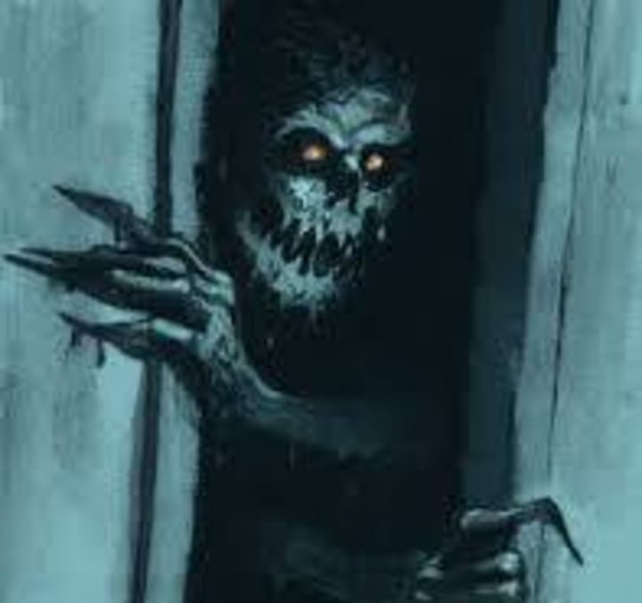 Raven-Wolf expresses a wish to comprehend Tasslehoff {Karakorum-Warlock} psychosis and trauma, proposing twice-weekly appointments. Tasslehoff Karakorum-Warlock goes to schedule his next appointment with the nurse, but discovers she’s not there. While back at the “Raven-Wolf” office, Tasslehoff Karakorum-Warlock is intrigued by a mysterious noise coming from the closet. While Tasslehoff {Karakorum-Warlock} trembles in fear, the closet door ominously opens, and the Boogeyman emerges, still gripping its “Raven-Wolf” human skin mask.