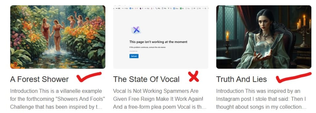 I thought this was because the outer two had engaging pictures and the middle one was just a web page that was down. So initially it looks like a picture can tempt people into your story, in fact, one new reader came in because they like forests and liked the picture.