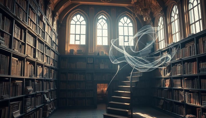 A serene library filled with ancient books, sunlight filtering through tall windows casting warm shadows, a spiral staircase leading to a cozy reading nook, ethereal wisps of imagination floating in the air, symbolizing the transformative power of storytelling.