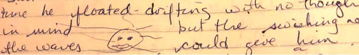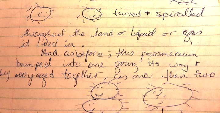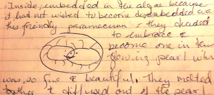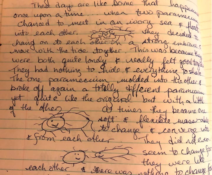 Here is the chicken scratch of my first creative work that tried to describe what I considered was a revolutionary concept, that I was bound and determined to eventually prove. In this story I explained how the paramecium would constantly change, and if alone and cold, would convolute into itself. It hid under a clam shell and was safe but still influenced by the current. However, living in the darkness of the shell was not all that the paramecium wanted. The paramecium chose to leave isolation.