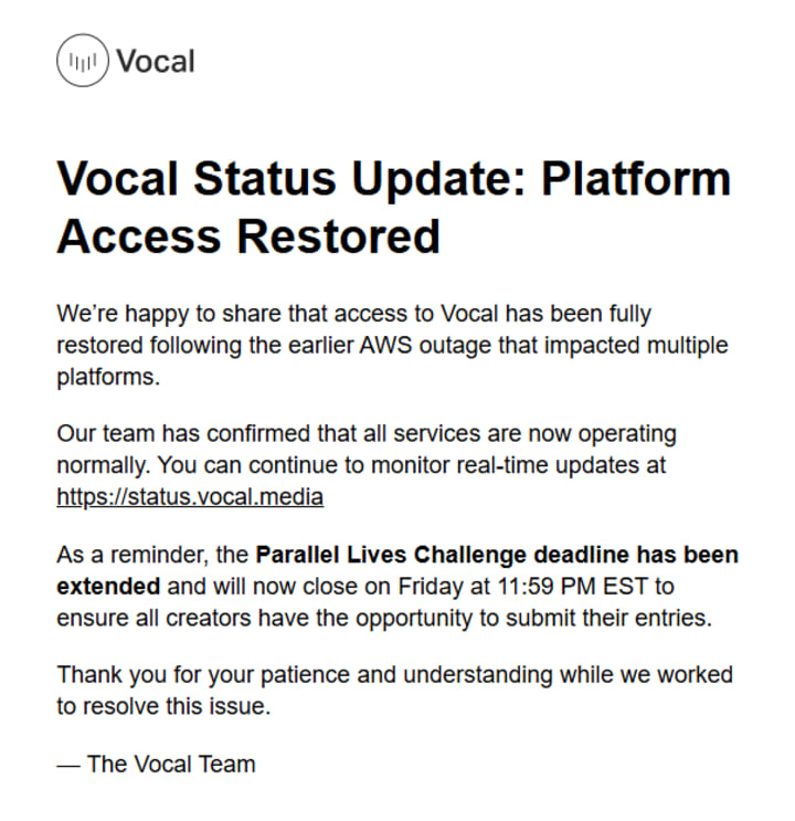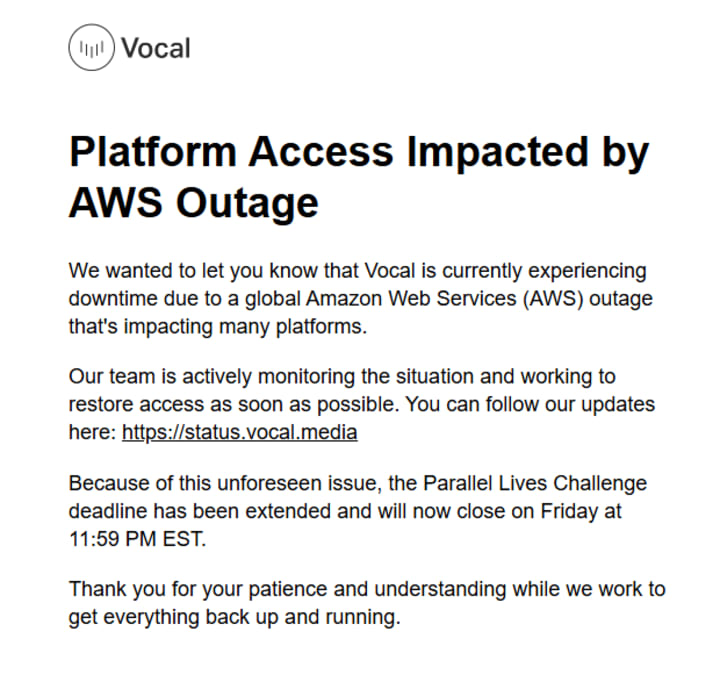 SO AWS has caused Vocal and Blue Sky to go down. Although this stops us from publishing on Vocal, it does not stop us from writing and creating.