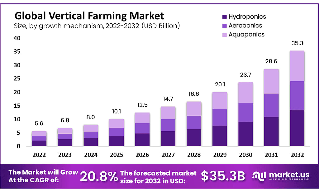 Global Vertical Farming Market size is expected to be worth around USD 35.3 Billion by 2032 from USD 5.6 Billion in 2022, growing at a CAGR of 20.80%