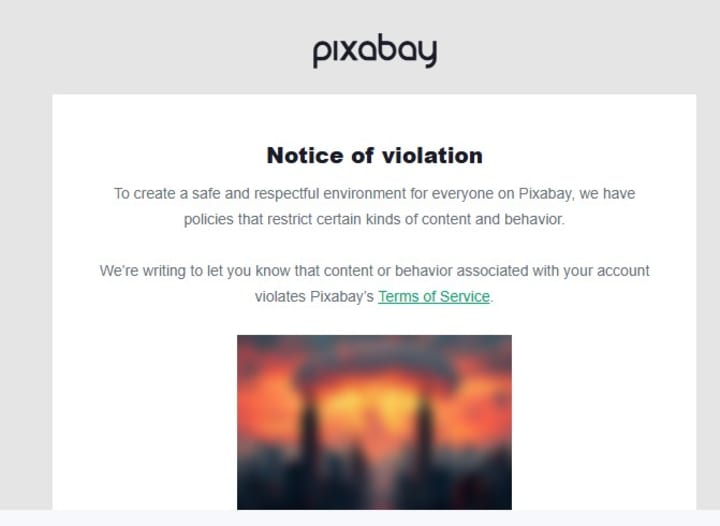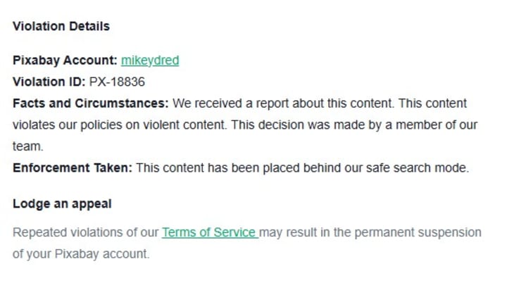 Someone had complained about the image, and while it shows a bomb going off I don't see what the problem was that the person who reported it had, but Pixabay gave me a full explanation of what had happened.